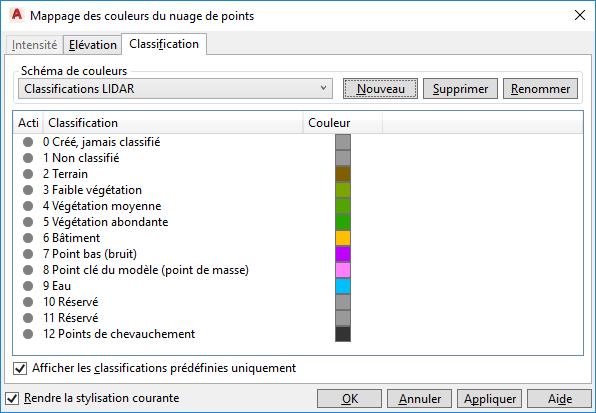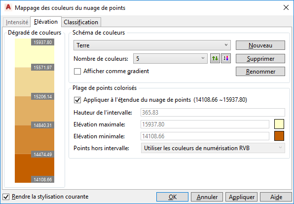Remarque : Les stylisations Intensité, Elévation et Classification sont basées sur les schémas de couleurs affectés dans la boîte de dialogue
