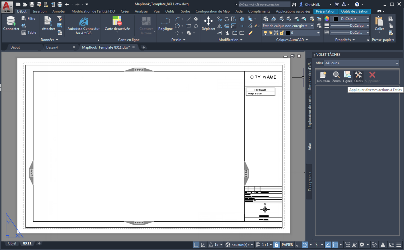 Après avoir défini le gabarit d'atlas et enregistré votre carte, vous pouvez publier l'atlas dans un traceur ou dans un fichier DWF.