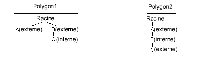 Les objets de type polygone gèrent une arborescence pour effectuer le suivi des limites et identifier les niveaux d'imbrication. L'illustration ci-dessous présente les arborescences associées aux deux objets précédemment exposés. La première arborescence de polygone comporte deux branches, alors que la seconde n'en contient qu'une seule.