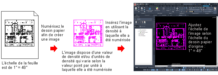 L'image dans l'exemple ci-dessous a été dessinée à une échelle papier de 1" = 48", numérisée à 300 points par pouce et insérée dans un dessin en utilisant la valeur de densité de 300 et le pouce comme unité de densité. Ensuite, sa taille a été modifiée en fonction de l'échelle papier 1" = 48".