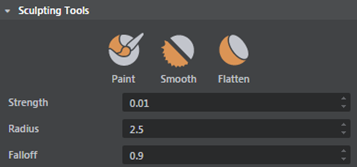 When you select a material map channel under Material Layer, this brush adds or subtracts from that channel.With the height map paint mode selected, dragging this brush over the terrain samples the height under the pencil and flattens nearby terrain to the same height.