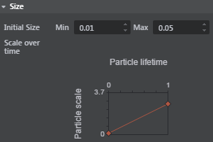 Select the Size component, and for the Initial Size property, change the Min value to 0.01, and the Max value to 0.05.