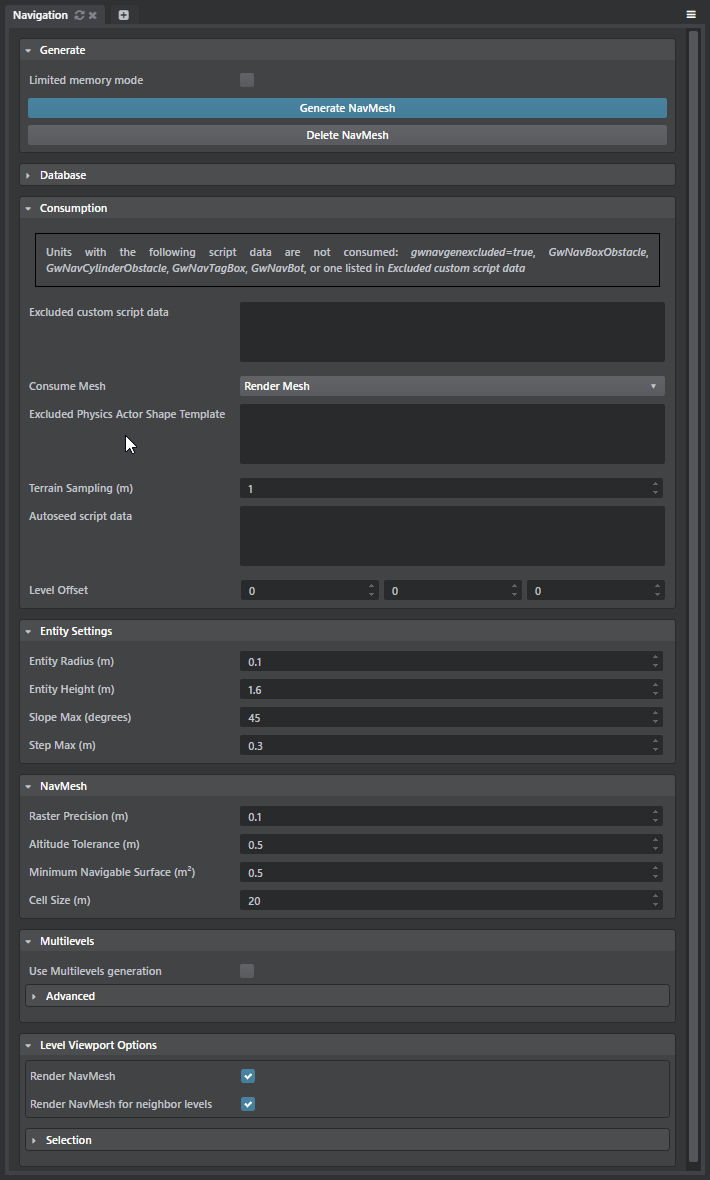 To set up, enable, and generate multilevel NavMeshes, create multilevels.gwnavgen_firstinit file. This file is used to intialize the multilevels NavMesh generation. Each level listed will have its generation settings aligned with the first level generated with 'Use multilevels' checked, and their offset set as specified. The offset must be the one corresponding at runtime. This file is optional; it is also possible to setup the multilevels directly in the Navigation panel of the editor, by checking 'Use multilevels' for each level implied in the multilevels generation.