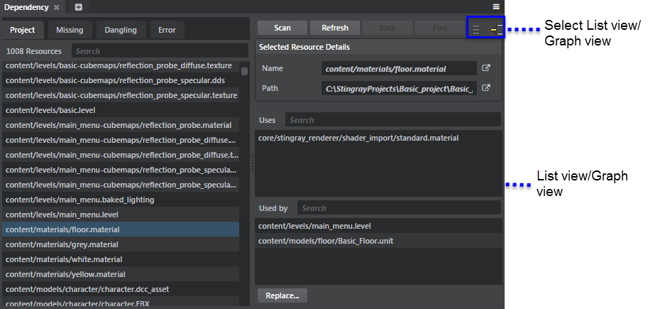 Use the Dependency tool to find which assets are used in a level, which are not used, to check file dependencies, and to easily replace files.