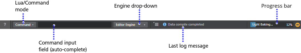 At the bottom of the interactive editor, the Status bar lets you manipulate instances of the engine using the command input field. The main areas of the Status bar include: