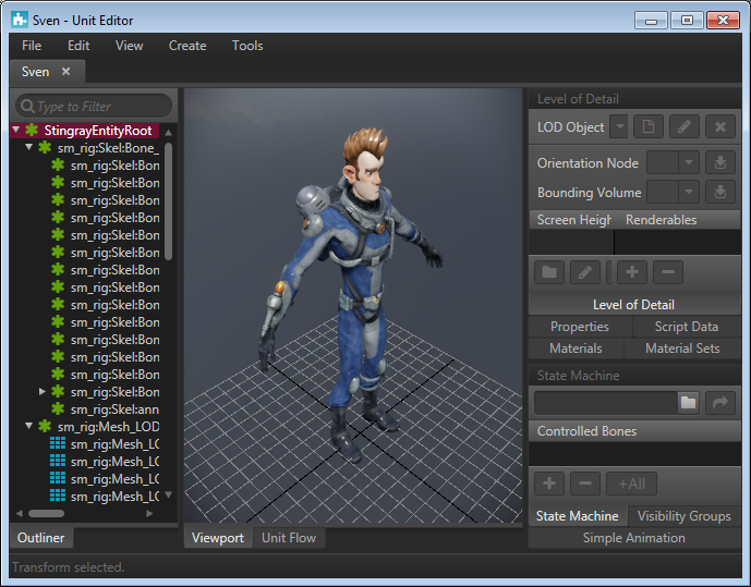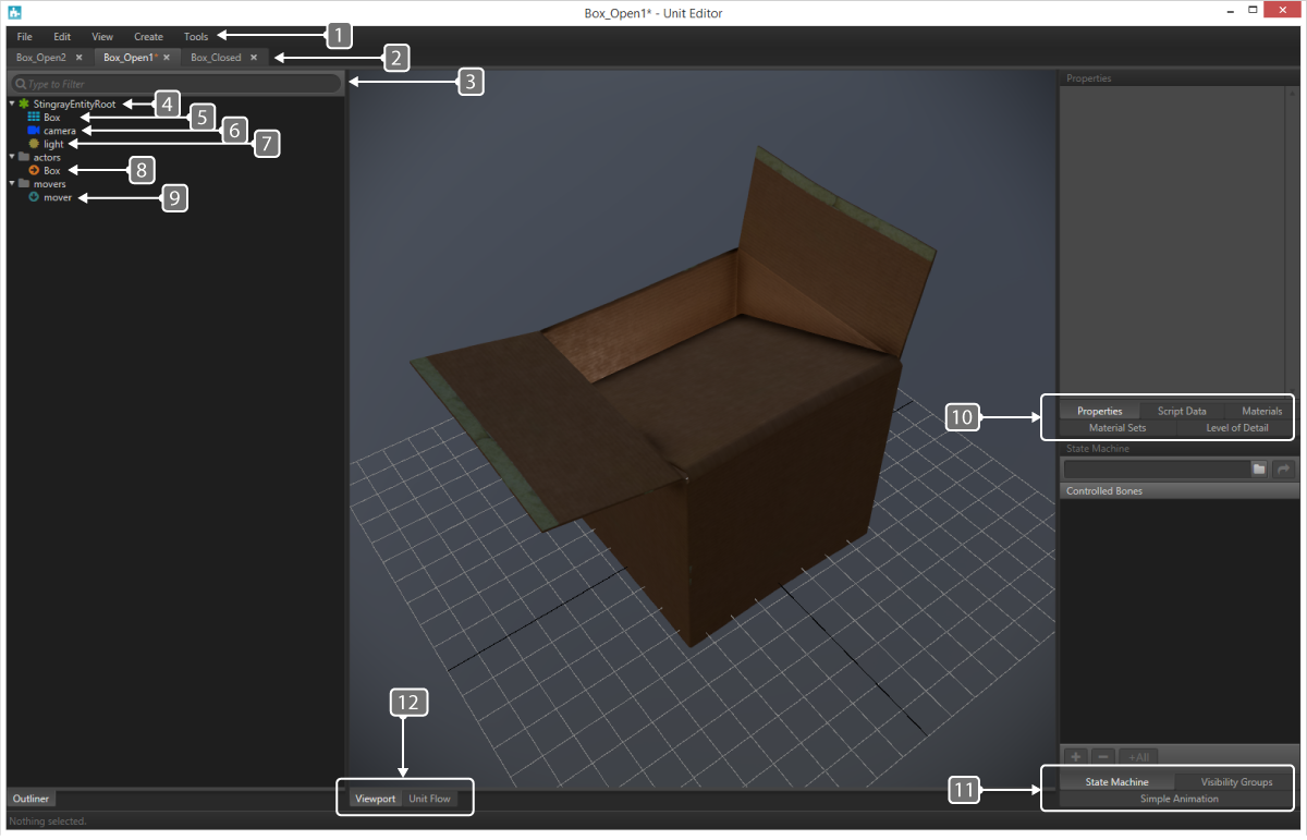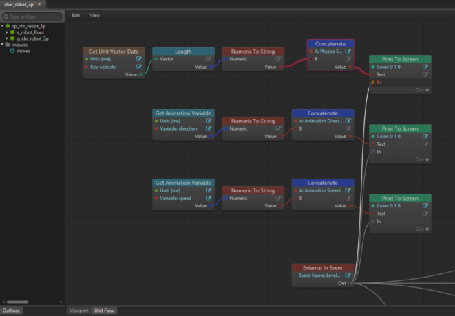- Unit Flow: Flow control of the unit. (See Visual programming using Flow for details on unit flow vs. level flow.) This part of the Unit Editor lets you create logic specific to a given unit such a character, prop, or other object while it is loaded in the engine. This is useful for doing things like character controls or prop effects.