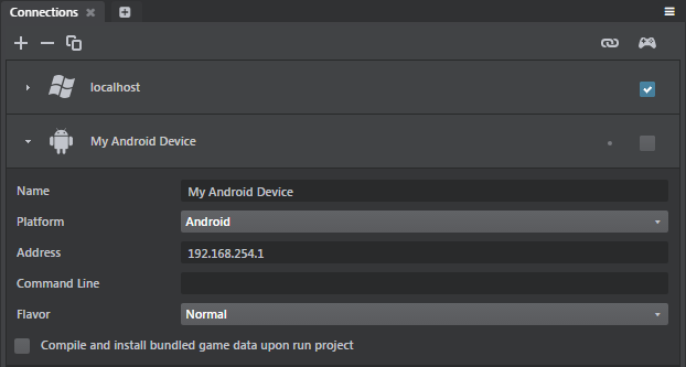 Note: In the Address field of the Connections panel, you must enter the IP address of your Android device. You can find this in your device's settings.
