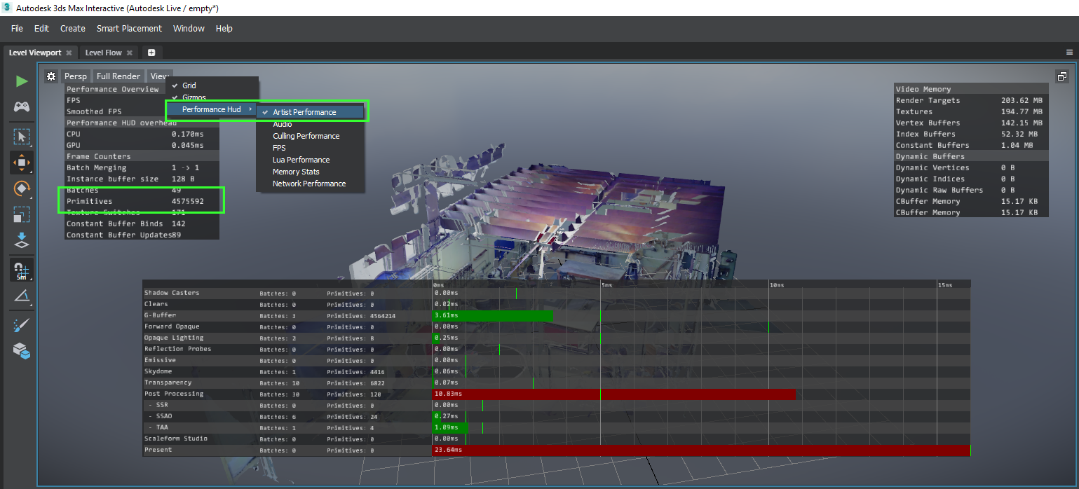 Tip: To view the triangle count in 3ds Max Interactive, click View > Performance Hud > Artist Performance button in the Level Viewport: