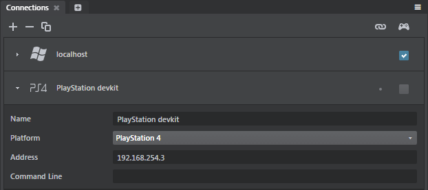 In the interactive editor, use the Connections panel (Window > Deploy and Connect > Connections) to set up a connection to the PlayStation 4 device:
