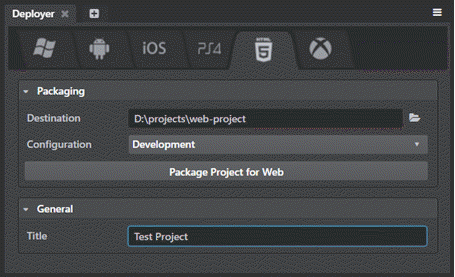 To deploy your project to disk (to get it ready for hosting on a web server), you'll use the Deployer panel. Go to the tab with the HTML5 icon, set up the requested fields, and click Package Project for Web.