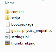 Each project source folder contains, at a minimum, the following files: boot.package, global.physics_properties, and settings.ini.