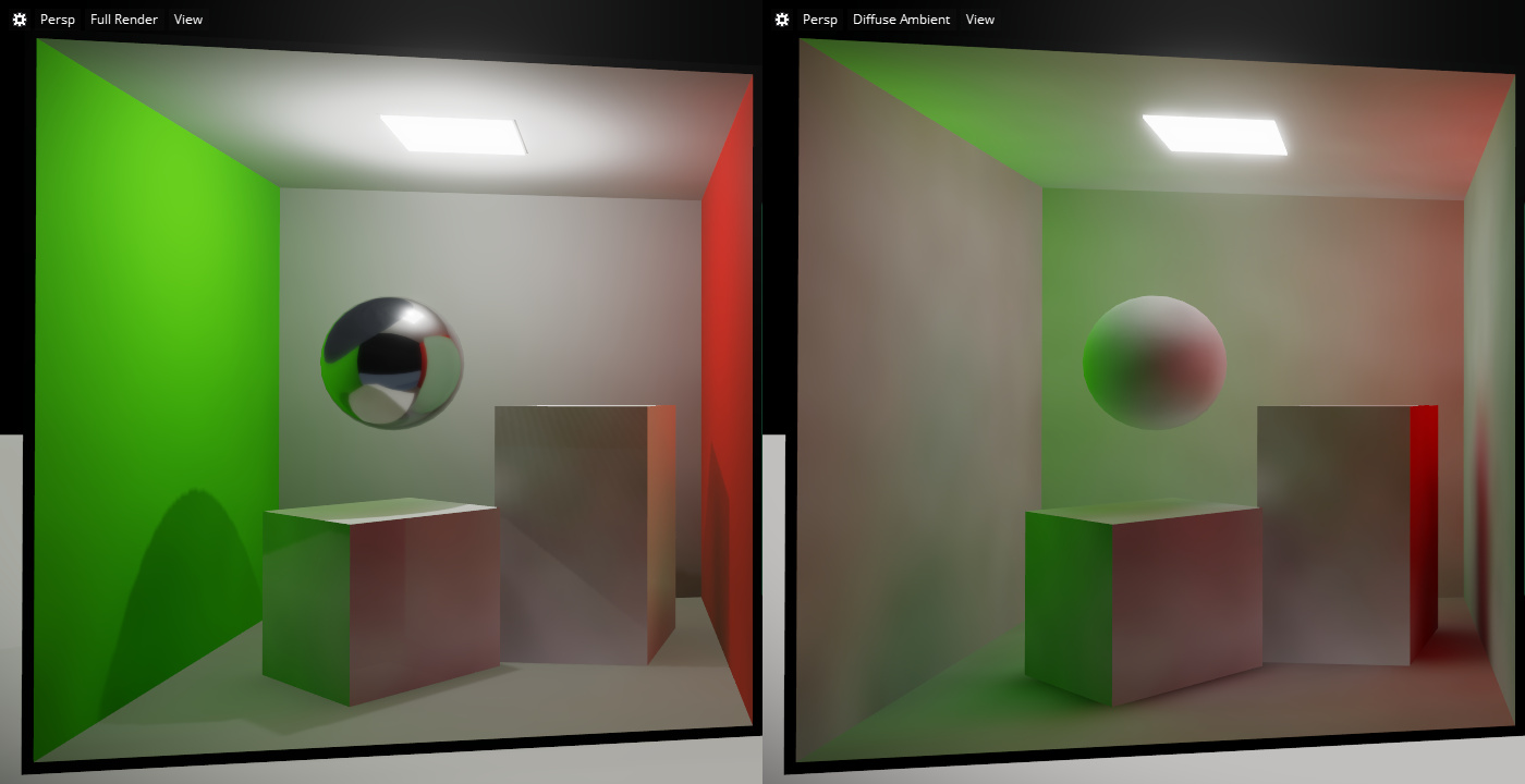 For example, the image below on the left shows a fully rendered scene. The right shows only the indirect illumination stored in the lightmaps, which clearly shows the green and red colors bleeding from the side walls into the indirect light that shines on the other parts of the scene. (The color bleed is more subtle in the full render due to direct lighting from the overhead light, and due to specular reflections that are drawn from a reflection probe located in the middle of the box, not shown.)