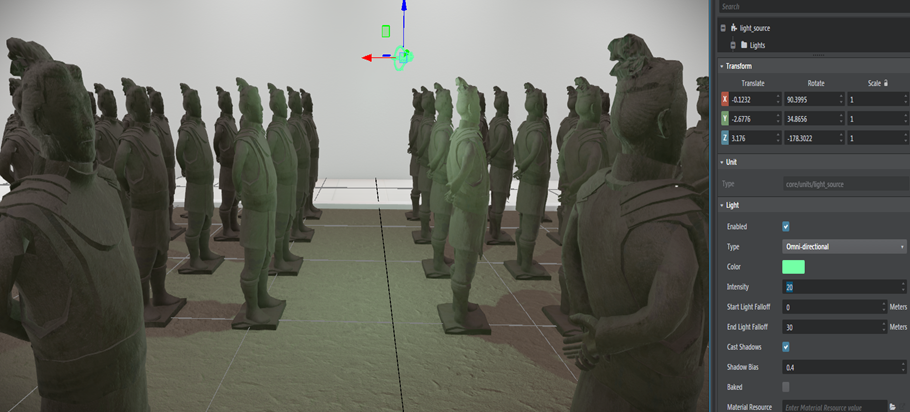 Note that, in contrast to the directional light image above, the shadows from the statues are not parallel, since the light radiates outward from a single point.
