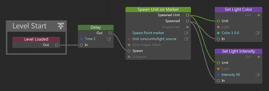 The new unit is automatically set up with a light source. You can then set up its properties using other Flow nodes in the Light category, or using the stingray.Light object in Lua.