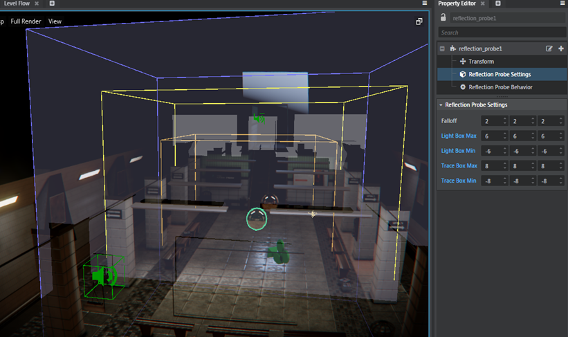 The Light Box Min and Light Box Max settings control where in the level the reflections are shown when the level is rendered in the engine. Only surfaces inside this volume will be lit by the reflections baked for this probe.