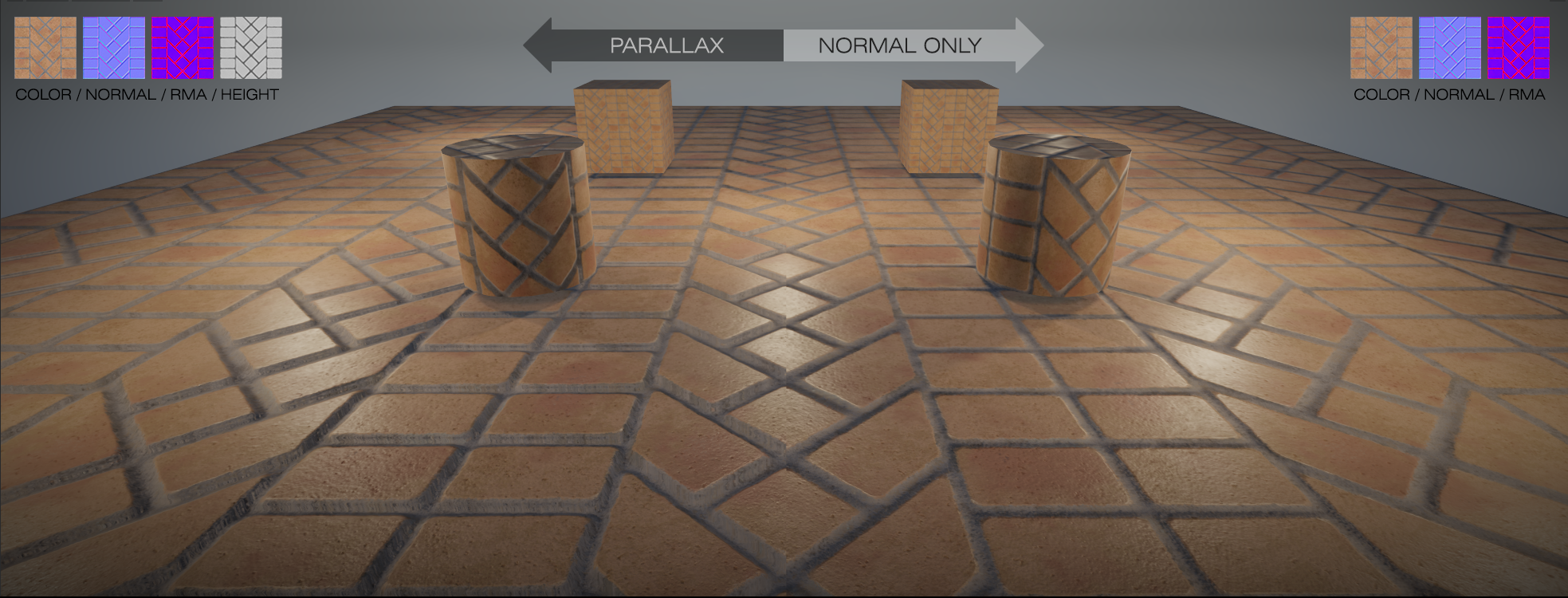 Parallax mapping is a technique used by 3D graphics engines to increase the apparent depth of a texture beyond what a normal or bump map could do. Similar to normal mapping, parallax mapping is calculated in tangent space. By using a combination of the diffuse/albedo, height map, and the normal map, the shader self-highlights and self-shadows the material while performing offsets to give a more dramatic and believable depth to the surface.