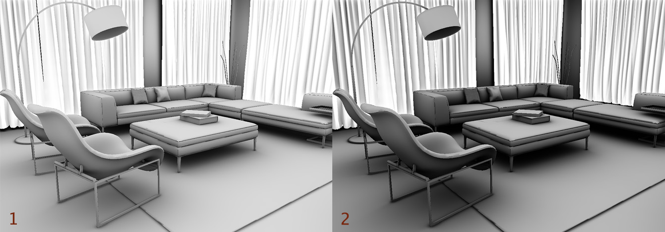 Scales the contribution from the baked AO, offering more artistic control. Modify this value if the reflection is removing too much of the contact shadows in your scene. In the following example, Reflection Occlusion Falloff was increased, and AO vizualization mode is used to illustrate the results.