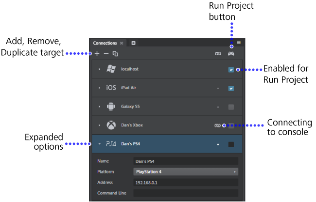 You can use the Connections panel to configure remote devices and web browsers as targets for the interactive editor. Once set up as a target, you can run your project on the device or in the browser. You can also mirror the editor viewport to a connected device. (Mirroring the viewport to a browser is not currently supported.)
