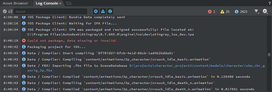 Every time the Log Console receives a message from an instance of the engine, it records the name of the component or subsystem that sent that message. You can toggle the display of all log messages based on the subsystems that originated them. For example, you might want to hide all messages from a particular subsystem like the data compiler, or you might want to hide messages from other subsystems so that you can zero in on a particular subsystem.