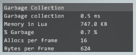 perfhud lua: Shows the memory used by the Lua environment, including the percentage used by the built-in garbage collection system. See the Optimize Lua environment and scripts section below.