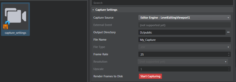 Capture settings are resources used only by the editor that specify parameters for capturing a stream of images from the viewport and saving the result as a set of .exr files. This usage showcases how a custom asset type can make the Property Editor act like a specicalized editing tool. For background information about working with capture settings, see the pages under Capture Frames Tool.