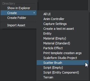 This makes it relatively easy for you to add new types of assets to the project that are used only by the editor to author other kinds of project data. For example, this mechanism is used to save data about scatter brushes to resource files -- data like what units the brush should scatter, at what frequency and what orientation. However, this information is only read by the editor in order to define how and where units get placed in the level while the brush is active. If you need your new type of asset to be available at runtime in the engine, you will need to extend the engine with a plug-in that defines how it should compile your new asset type for runtime use. See also Extend the Engine.