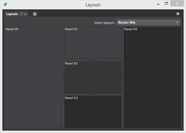 Resizer layouts are similar to Simple Layouts but with the ability to be dynamically resized. Each panels can have a min-size attribute in px which controls the minimum panel size and also a ratio attribute which controls the initial panel size compared to other panels ratios.