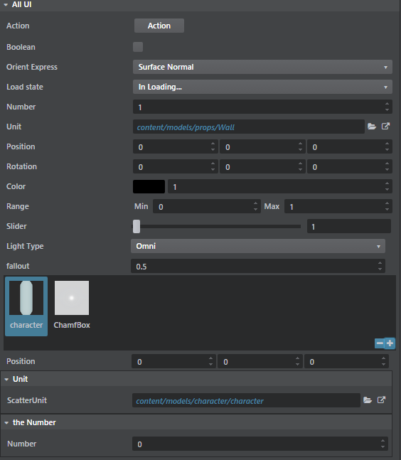 var stringProperty = props.color("Color", genModel([1,1,1])); var colorModel = genModel([1,1,1]); var intensityModel = genModel(1); var hdrColorProperty = props.hdrColor("Color", colorModel, intensityModel);