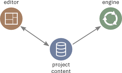 The picture of the three components above is conceptually true when it comes to the general roles of the three components, but in fact the interactions between the editor, project content and engine are much more intricate: