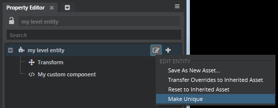 Note that only entities that are defined in .entity resources can be used as inherited assets. An entity that lives only within a level cannot be set as a parent, although you can create a new entity asset from that level entity. See Create a new entity asset.