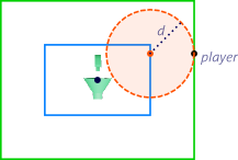 For instance, when the player (p) enters the outer volume from the right, the event plays from the red spot on the inner volume. The dotted line shows the limit of the sound's attenuation range. As the player moves around, the sound tracks the player's position by moving to the nearest point on the inner volume. When the player enters the inner volume, the sound follows the position of the player.