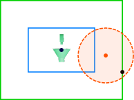 For instance, in the following images, each time the player enters the outer volume, a new location is chosen for the sound that is closer to the player than the maximum attenuation distance of the sound. This ensures that the player will hear the sound immediately, though the exact position of the sound will be randomized.