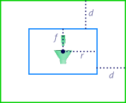 An audio source with a Box shape has an inner volume that is defined by distance values along its local right (r), front (f) and up axes. These values are set as properties of the audio source. Its outer volume is a box that enlarges the inner volume by the maximum attenuation distance (d) of the sound event.