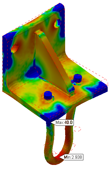 Tip: The actual maximum safety factor is many times greater than the minimum value, which skews the contour color towards red for most of the model. Reducing