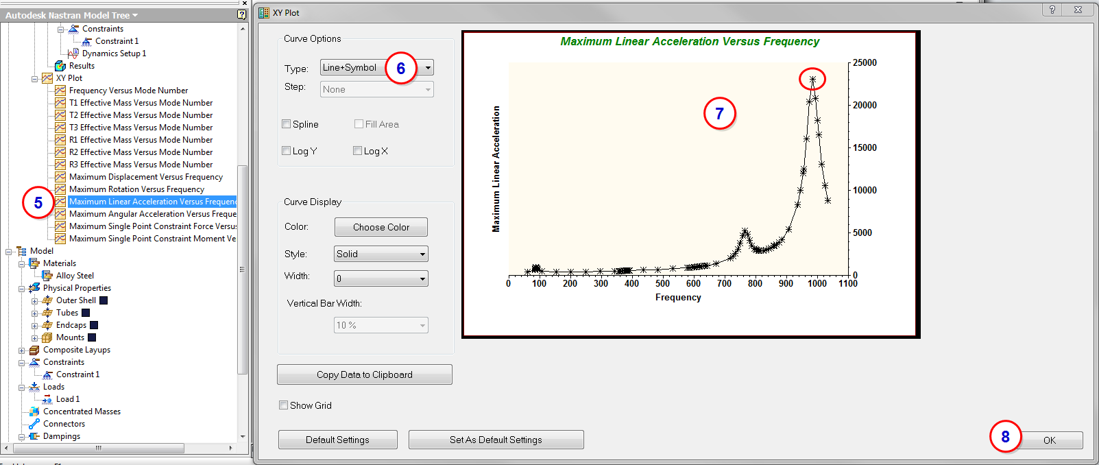 Maximum Displacement Versus Frequency plot from the Analysis tree.