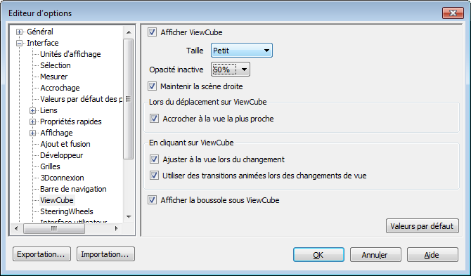 - Dans l'Editeur d'options, accédez à la page ViewCube sous le noeud Interface et sélectionnez l'option Utiliser des transitions animées lors du changement de vue.