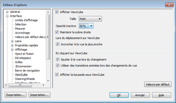 Pour contrôler l'opacité de l'outil ViewCube lorsqu'il est inactif