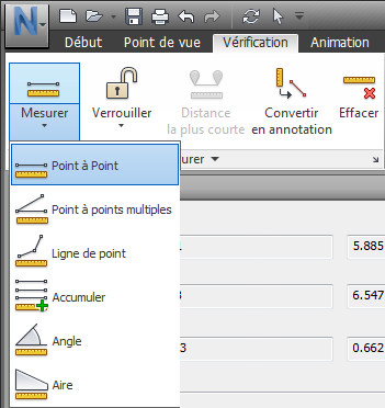 Ces outils permettent d'effectuer des mesures entre différents points des éléments du modèle. Toutes les mesures sont exprimées dans les unités d'affichage. Les outils de mesure sont disponibles dans l'onglet Vérification