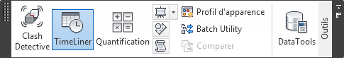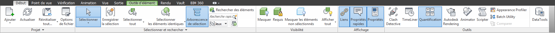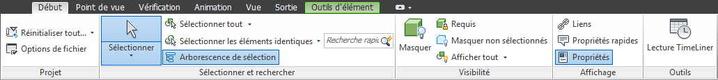 Le ruban est composé d'onglets qui correspondent chacun à une activité spécifique. Chaque onglet contient des groupes de fonctions, spécifiques à des tâches, qui regroupent les outils. Certains onglets sont contextuels. L'exécution de certaines commandes entraîne l'apparition d'un onglet contextuel spécial, à la place d'une barre d'outils ou d'une boîte de dialogue. Par exemple, dès que vous sélectionnez des éléments dans la vue de la scène, l'onglet Outils d'élément s'affiche. En l'absence de sélection, il est de nouveau masqué.