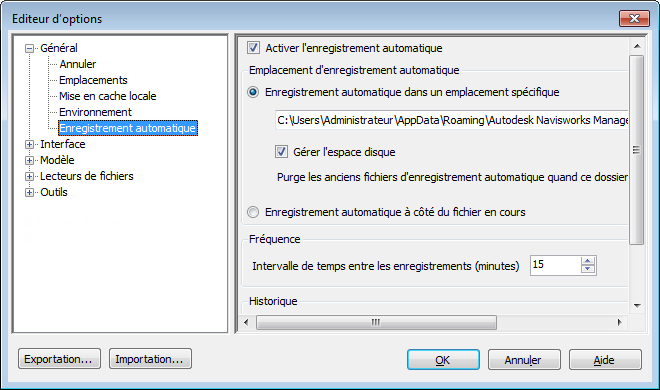 - Modifiez les options d'enregistrement automatique, selon vos besoins. Si, par exemple, vous souhaitez qu'Autodesk Navisworks enregistre un fichier de sauvegarde toutes les 20 minutes après une modification significative, tapez 20 dans la zone Intervalle de temps entre les enregistrements (minutes).
