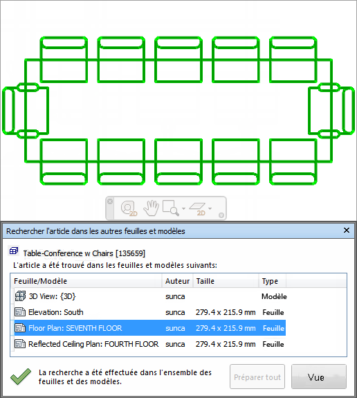 dans la fenêtre Rechercher l'article dans les autres feuilles et modèles, cliquez sur le bouton Préparer tout. Une fois l'ensemble des feuilles et modèles préparés, la liste de l'ensemble des feuilles et modèles contenant l'objet apparaît.