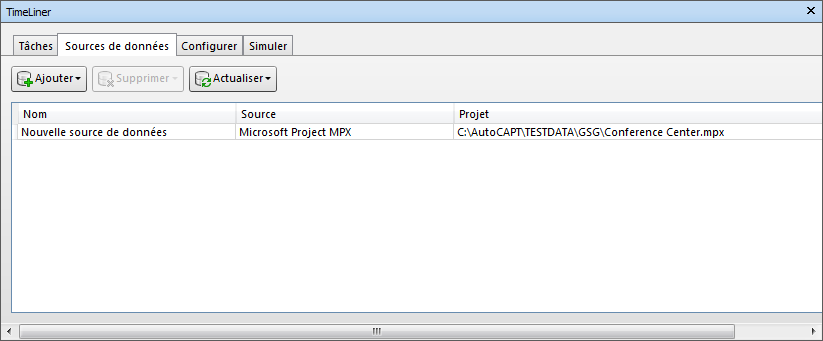 L'onglet Sources de données permet d'importer des tâches à partir d'un logiciel de nomenclature indépendant tel que Microsoft Project, Asta et Primavera. Il énumère toutes les sources de données ajoutées sous forme de tableau.