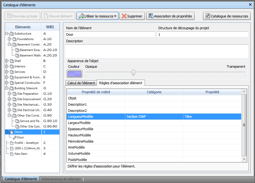 Dans certains cas, les données ne peuvent pas être associées automatiquement, car les objets ne contiennent pas la propriété par défaut utilisée pour l'association automatique, ou il se peut que vous souhaitiez modifier l'association de propriétés par défaut. Dans ce cas, vous pouvez personnaliser et créer des définitions de propriétés pour le projet. Les propriétés individuelles ou globales peuvent être modifiées et appliquées aux données de métré 2D et 3D.