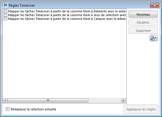 dans l'onglet Tâches ou cliquer avec le bouton droit de la souris dans la zone Tâches et créer un jeu initial de tâches basé sur le nom des calques, des éléments ou des jeux de sélection. TimeLiner offre par défaut plusieurs types de tâche (Construire, Démolir et Temporaire), mais vous êtes libre de définir vos propres types de tâche dans l'Onglet Configurer. Vous pouvez également afficher une représentation graphique en lecture seule de la nomenclature de votre projet et avez le choix entre trois diagrammes de Gantt : Planifié(e), Réel(le)et Planifié / réel.