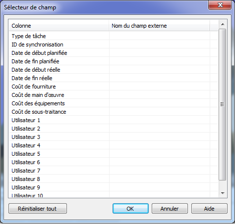 Ce champ sert à identifier de manière unique chaque tâche importée. Cette option rend possible la synchronisation même si des modifications importantes sont apportées à la nomenclature externe dans le programme de nomenclature. Le comportement par défaut consiste à faire appel au champ le plus approprié pour chaque source. Certaines sources n'ont pas d'identifiant unique bien défini, auquel cas il vous faudra parfois choisir un champ manuellement.