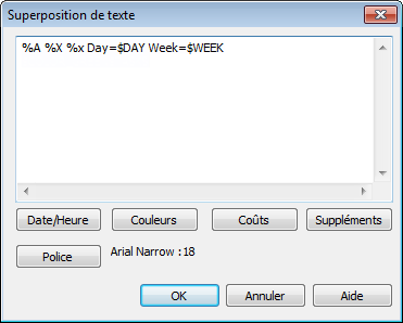 Paramètres régionaux. Vous pouvez spécifier le format exact à utiliser en saisissant du texte dans la zone prévue à cet effet. En général, le texte s'affiche tel que vous l'avez saisi. Toutefois, les mots précédés par "%" ou "$" font office de mots clés et sont remplacés par des valeurs propres. Les boutons Date/heureCoût et Suppléments permettent de sélectionner et d'insérer tous les mots clés possibles. Le bouton Couleurs définit la couleur du texte superposé.
