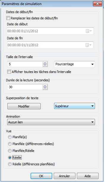 Il est possible de remplacer les dates de début et de fin entre lesquelles la simulation est exécutée. Cocher la case Remplacer les dates de début/fin active les zones de date et permet de choisir une autre date de début et de fin. Ce faisant, vous pouvez simuler une portion du projet. Les dates s'affichent dans l'onglet Simuler. Ces dates servent également à exporter les animations.