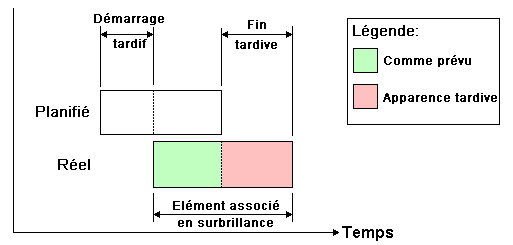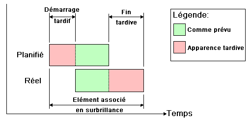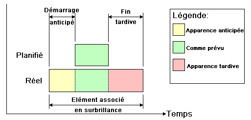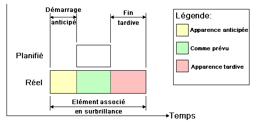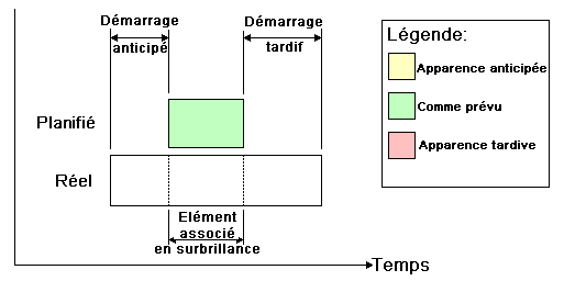 Il est également possible de mettre en surbrillance toutes les tâches traitées au cours de l'intervalle. En cochant la case Afficher toutes les tâches dans l'intervalle et en définissant la valeur du champ Taille de l'intervalle à 5 jours, par exemple, toutes les tâches traitées pendant ces 5 jours prendront la valeur Apparence initiale dans la vue de la scène, notamment celles du premier jour et du dernier jour. Le curseur Simulation met en évidence ces éléments en les soulignant d'un trait bleu sous le curseur. Si cette case à cocher est désactivée, les tâches qui commencent et finissent aux limites de l'intervalle ne seront pas mises en surbrillance et devront chevaucher la date actuelle pour apparaître en surbrillance dans la vue de la scène.