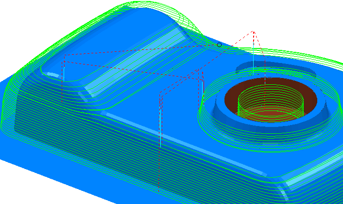 Additional stock — Use this option to help with ordering when machining between two steep walls so PartMaker produces a safe order with the level of stock specified here. Providing the passes are within the distance specified, an alternating toolpath is created, machining at one machining-level height on one wall, and then at the same height on the neighboring wall before descending to the next machining-level height.