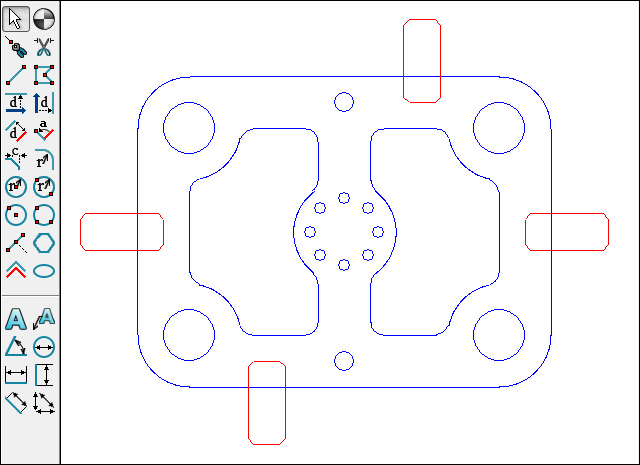 1. Using PartMaker's CAD mode, create 2D representations of the location of the work holding. In the following example, four hold-down clamps have been created: